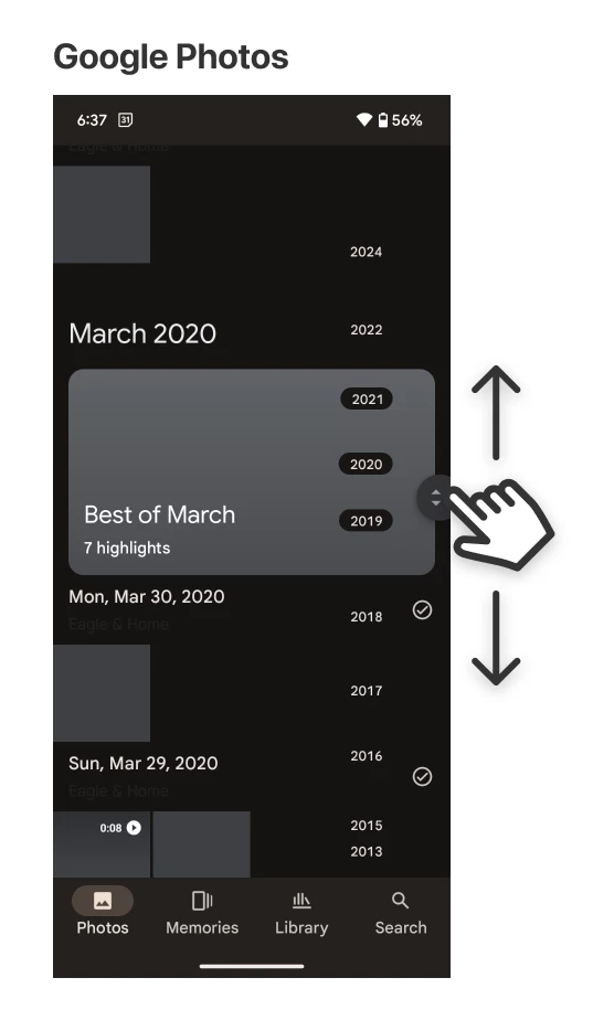 Personally, I prefer Google Photos scrubbing behavior as it shows all years vertically with monthly and daily section headers.
