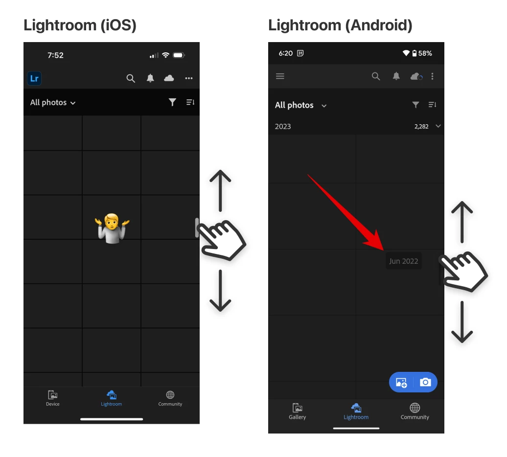 But at the very least, Lightroom on iOS should show the month/year in a tooltip while dragging.