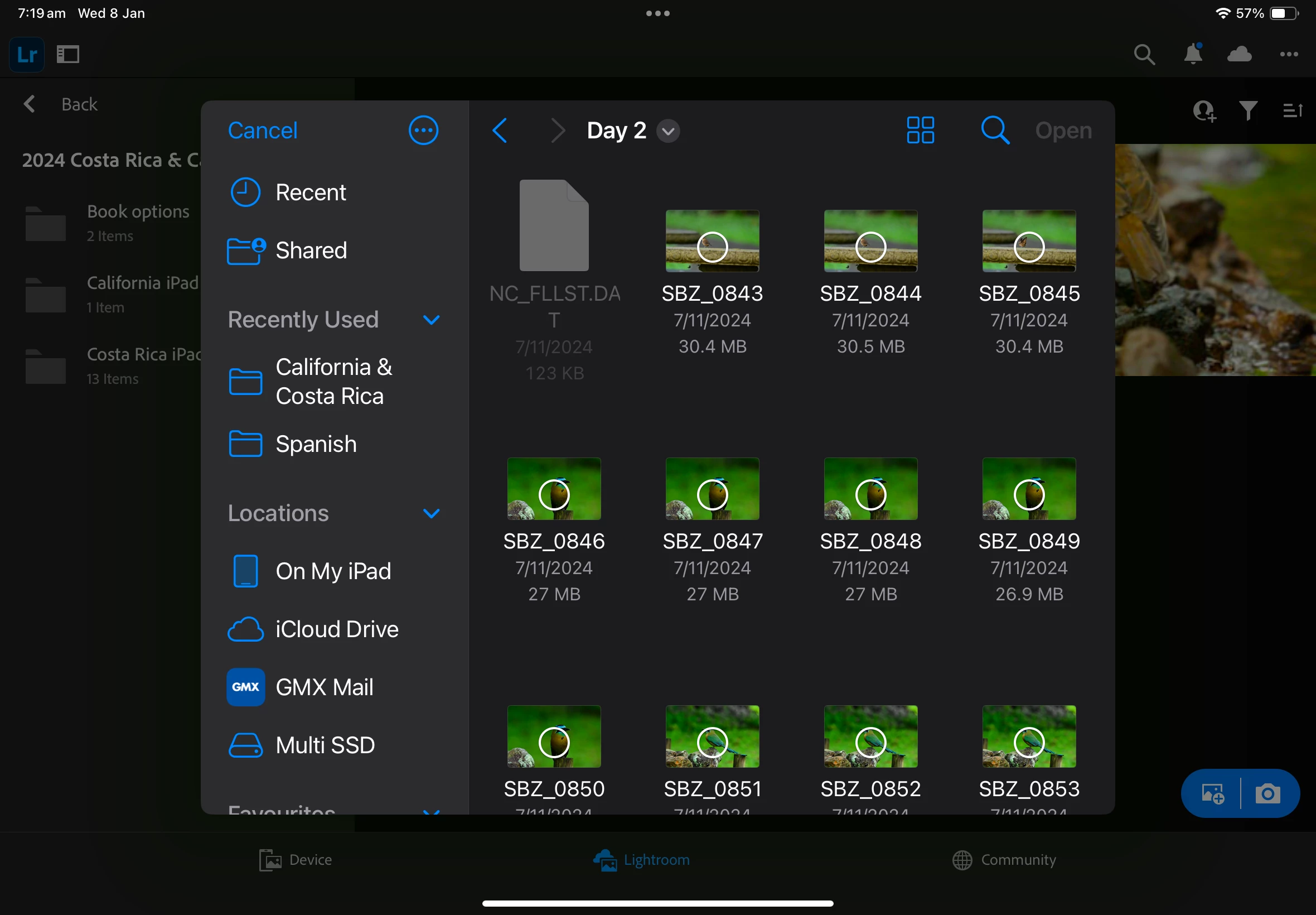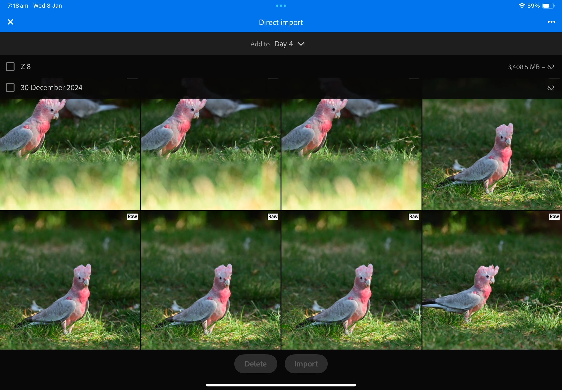 Hi all! I use an iPad (Air 5th Gen) in my workflow during photo trips. Each day, I backup the card (CFX-B) from my camera (Nikon Z8) to an external SSD and then make an initial cull and selection of images for upload/edit using Lighroom. When I add photos to Lightroom (v 10.1.1) directly from the card or camera, the image previews are a reasonable size and I have the ability to pinch zoom the previews to see which is in focus or a good composition (see screenshots below). If I try to do this from the file structure on the SSD backup (if, for example, I did not have time to cull on the day and the card had been erased for the next day's shoot), then the "add photos from files" option in Lightroom only allows small previews and does not allow zooming of the images. This makes it impossible to check which image is best for culling and uploading! Can the preview/zoom functionality of the "add photos from card/camera" please be replicated in the "add photos from file" option? Thanks!