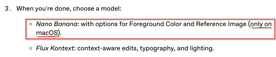 • Reference image upload (macOS only): allows guiding generation with any photo.