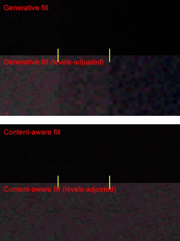 I'm sure this applies to other use-cases as well, but to me it appears most evident in dark backgrounds when using a text-prompt. Generative Fill applies a relatively strong tone-difference, where you can easily see the edges of the Generative Fill, whereas Content-Aware fill does much better job. Observe 2 x Generative Fill vs. 2 x Content-Aware Fill: