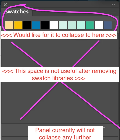 Currently, the swatch panel will not reduce to only show the small strip of recent colors. I prefer to remove the swatch libraries because they add no value to my work, but that leaves a large intrusive blank space.