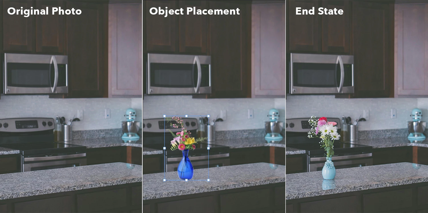 - Adaptive Synthesis: Generative AI synthesizes a new version of the object that seamlessly integrates into the scene, adjusting the lighting, perspective, shadows, reflections, and other visual properties to make the object appear as if it naturally belongs in the scene.