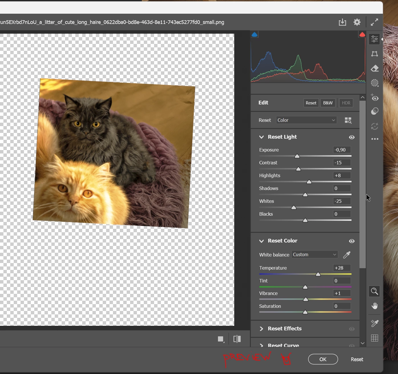 When using Camera Raw as a filter on individual layers within a composition, the adjustment window operates in isolation. Unlike other Photoshop adjustments that show real-time changes in the main canvas, Camera Raw only displays the preview within its own dialog window. The effects only become visible in the actual composition after clicking "OK" – making it impossible to evaluate color grading decisions in context with other layers.