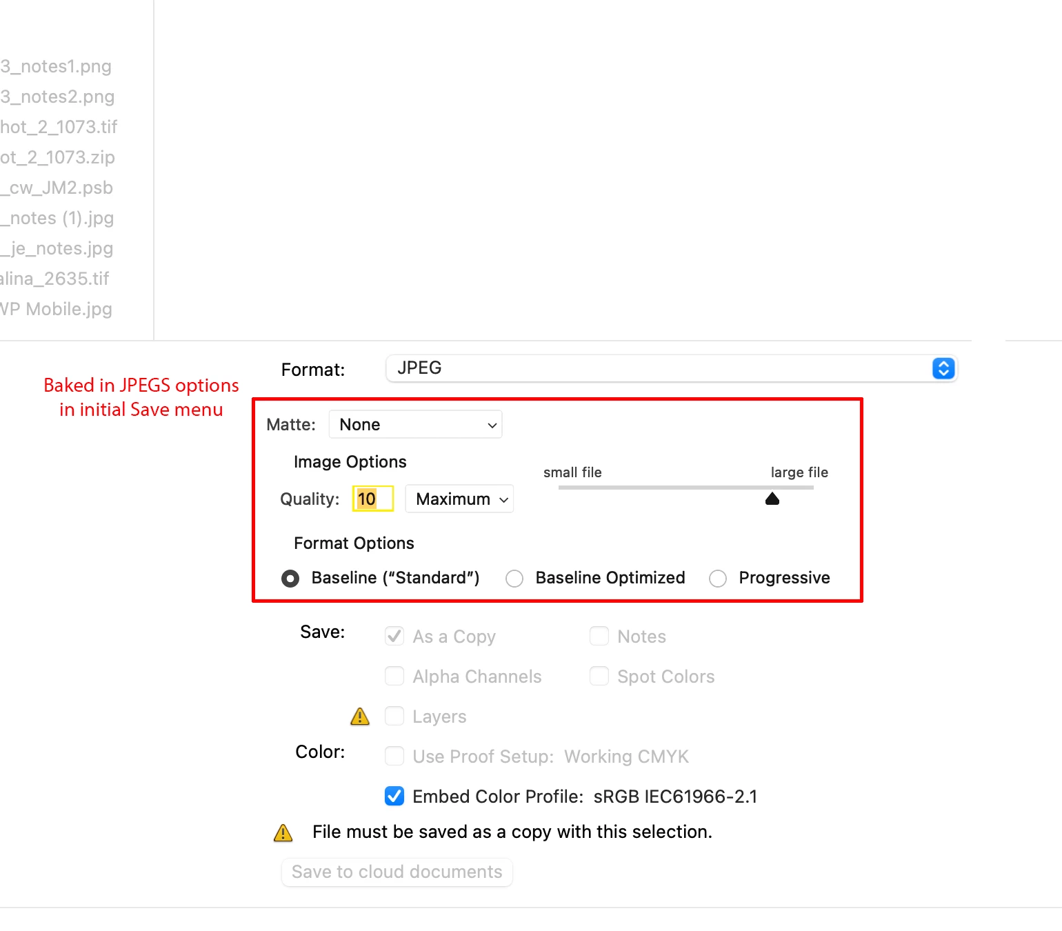 I have a request - I'm nearly always bamboozled saving JPEGS from PS. When I save, I switch to another application to send to clients. It happens that I forget to pause and wait for the quality sllider to pop up. It's always delayed, and I always move on too quickly. Wouldnt it be great if those settings could be defaulted in the PS settings OR could be baked into the initial save options.