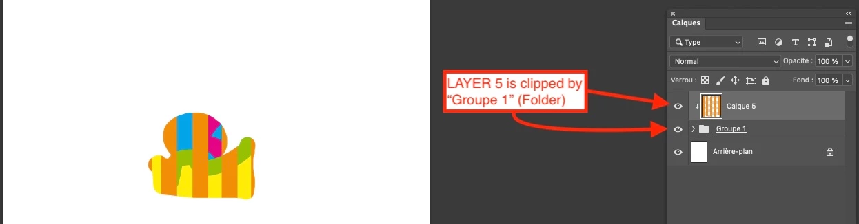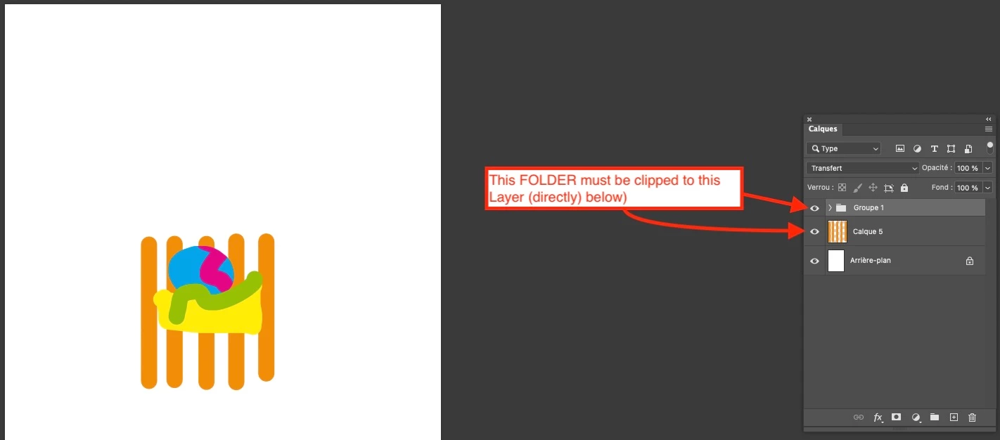 The SUM of the FOLDER content MUST BE clipped by the LAYER directly below.