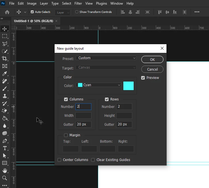 It would be nice when creating guides you could create both horizontal and vertical guides all at once. It is very tedious to have to create every single guide needed for a graphic project.