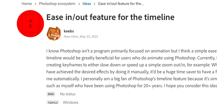 I know Photoshop isn't a program primarily focused on animation but I think a simple ease-in/out feature for the timeline would be greatly beneficial for users who do animate using Photoshop. Currently, I am limited to manually creating keyframes to either slow down or speed up a simple zoom out/in, for example. While, through practice, I have achieved the desired effects by doing it manually, it'd be a huge time saver to have a function that does this for me automatically. I personally am a big fan of Photoshop's timeline feature because it's simple and intuitive for users such as myself who have been using Photoshop for 20+ years. I hope you consider this idea. thank you!