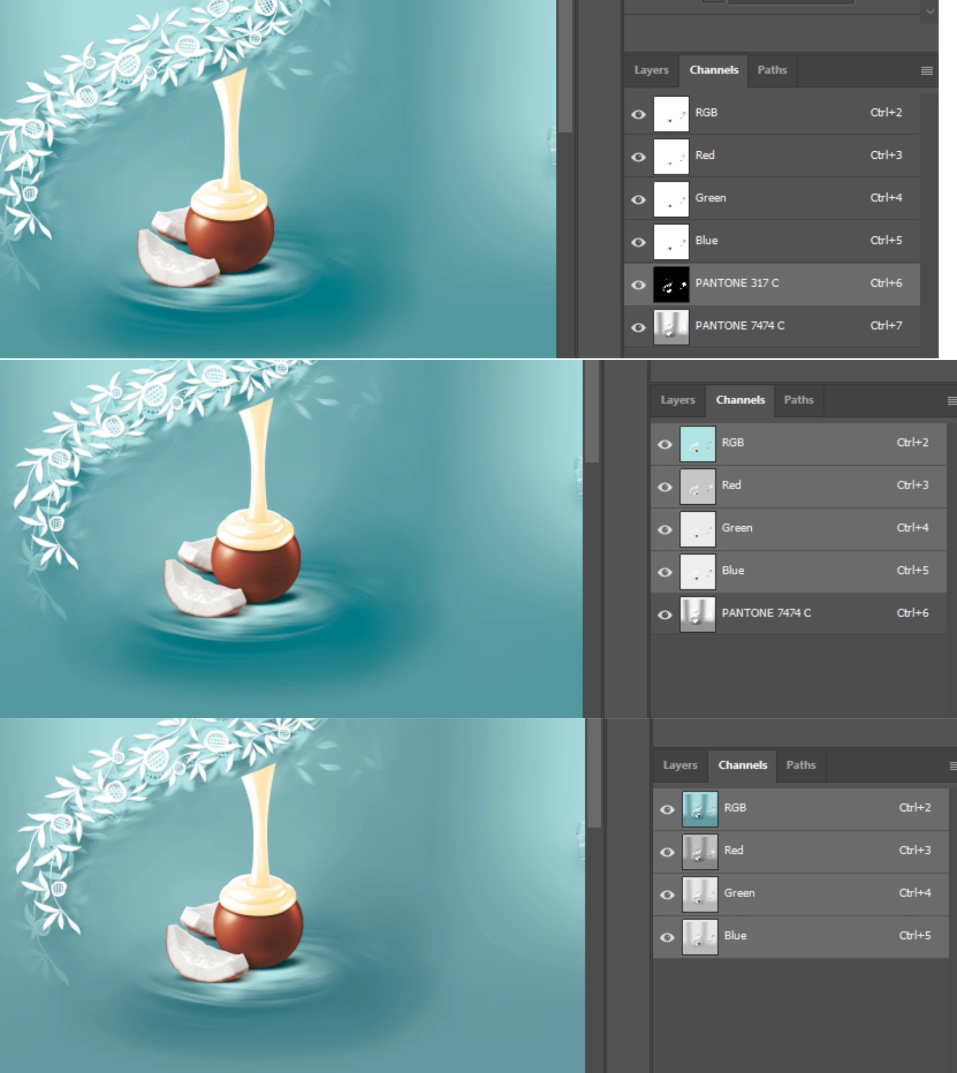 needed diferent colors for diferent colors for places where was diferent amounts of that dark green pantone color... but why should i be editing it by my eye when i could just take screen shots which would be simular to how it looks like before... (but i am expectation that photoshop shows it correctly before merging chanels)