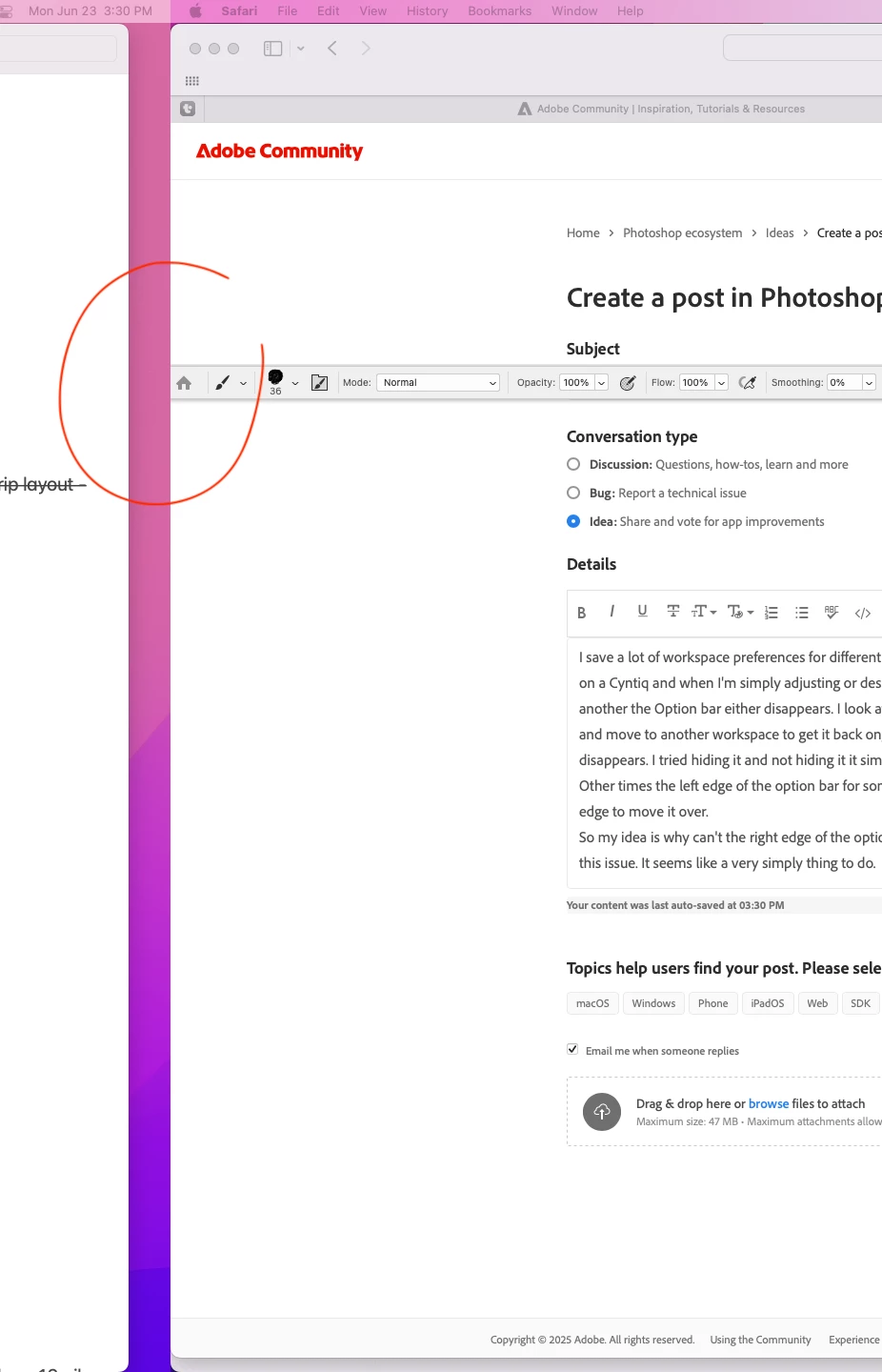 Other times the left edge of the option bar for some reason is in-between two screens and I can't grab the edge to move it over.