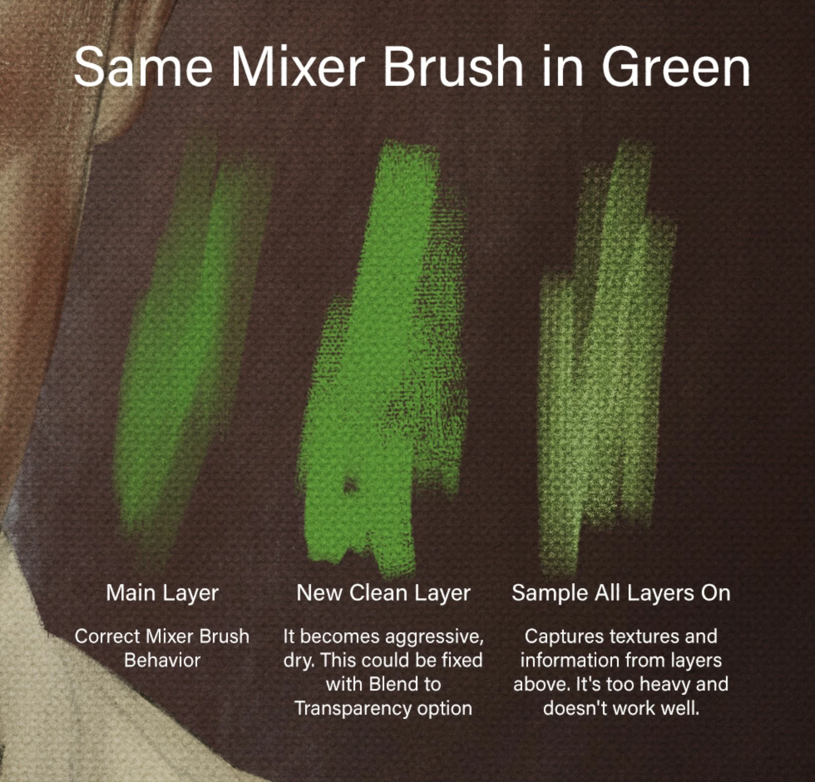 When I work with the Mixer Brush, I really miss that it blends to transparency. If I create a layer above and start painting, the Mixer Brush changes its behavior quite aggressively. I end up avoiding the creation of layers and hampering the flow of my work a little.