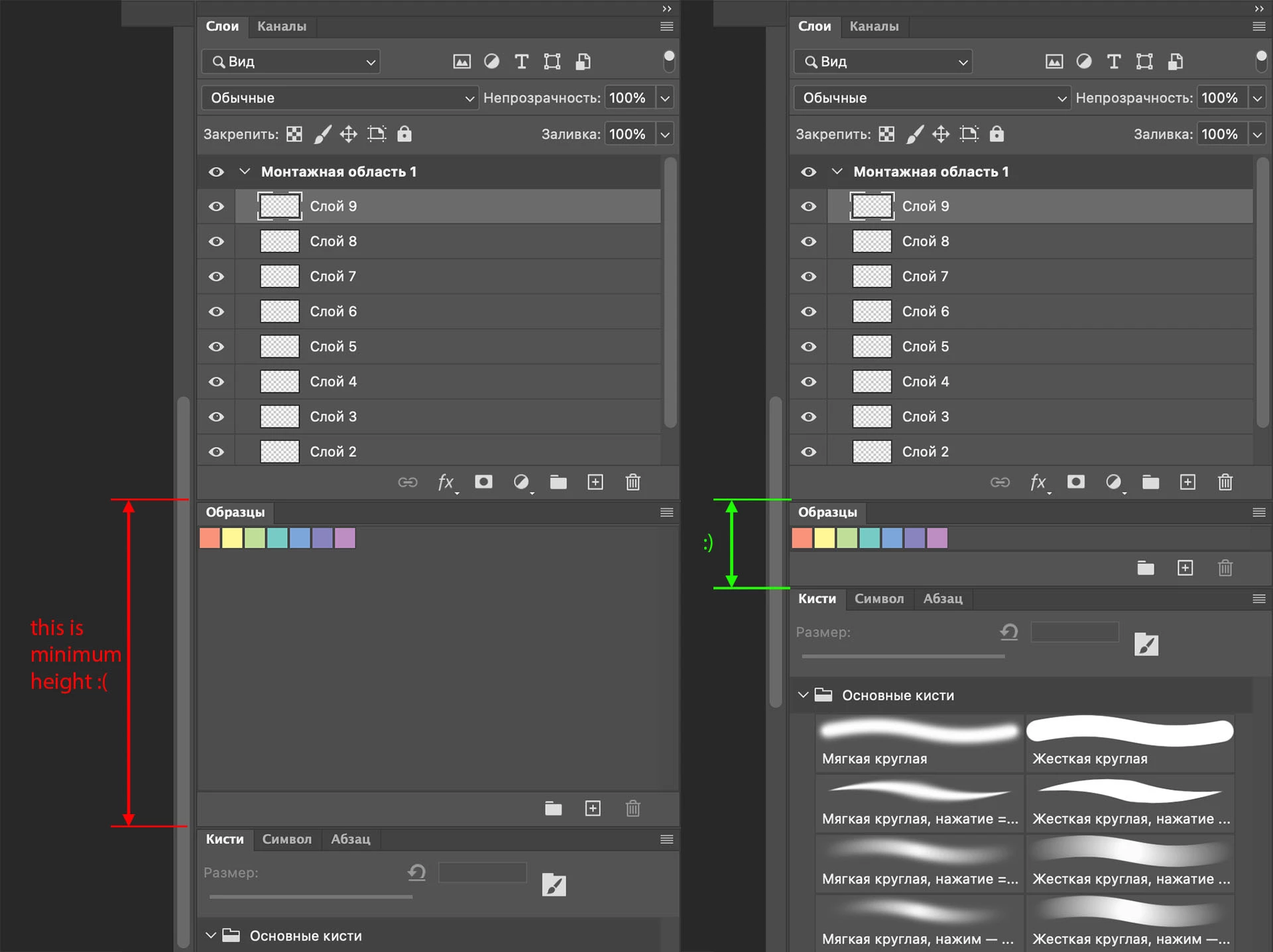 It would be great to reduce allowed the swatches window height. This will free up space for other windows, without having to keep them in hidden tabs and make unnecessary clicks while working.
