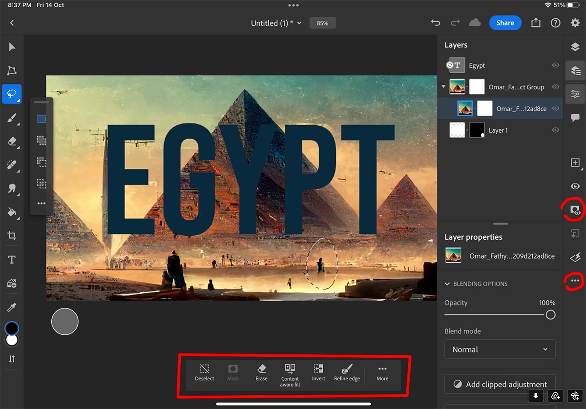 After making selection, options bar appear in the bottom with "Content Aware" & "Mask" options