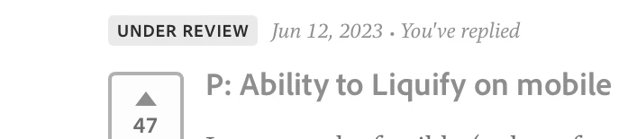 Yes, Liquefy is needed. Regarding *pete_b_28vgv42av7mxl, original opener, “It may not be feasible (at least for now) to add Liquify to Photoshop”, honestly, Adobe, I can’t see why it wouldn’t be feasible — ArtStudio Pro, Affinity Photo and Procreate have had some form of “liquefying” option for ages now. There is zero reason why Adobe does not have this implemented in their mobile version of Ps.