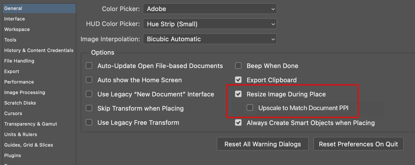 I find the General setting "Resize Image During Place" a bit misleading, since in reality it only downscales, and does not upscale in relation to pixel dimensions. I take it the current functionality accounting for PPI is very important to people working on print, but perhaps somewhat useless and even a pain for others, who work solely on digital, etc.