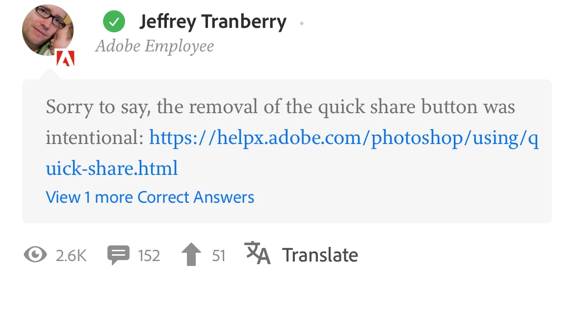 Adobe, bring back the Quick Share button that was at the top right of Photoshop (it was just removed with the April release of Photoshop 23.3)