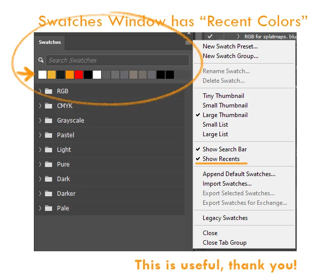 Hi there! I am a concept artist and game texture painter, and both me and my employer studio choose Photoshop for our content creation and have done so for years. I like Photoshop's "Recent Colours" as a feature, but I wish it wasn't hiding in the Swatches and Shapes windows: swatches and shapes are good for graphic design, but are not really relevant in a painter's workflow.