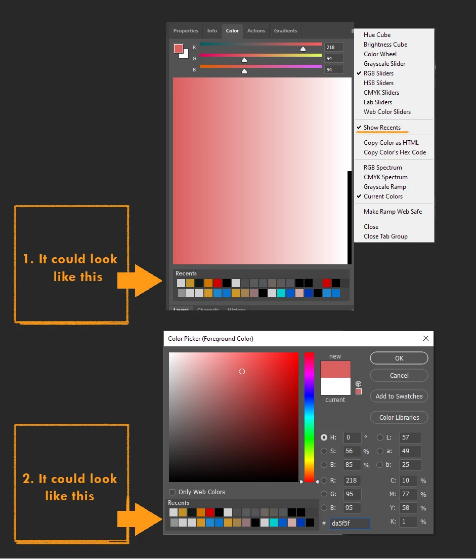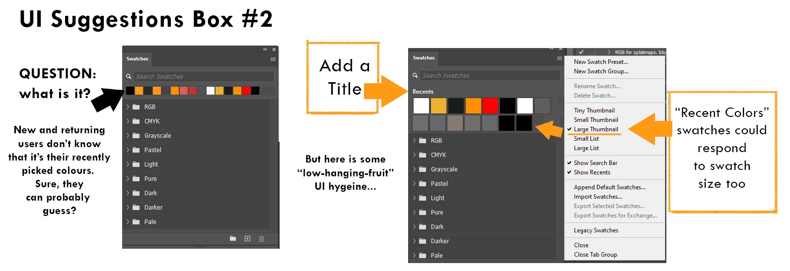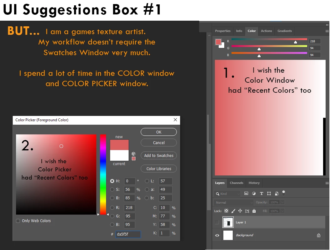 Option A) Adding "Recent Colors" to other tools in Photoshop. Adding to 1. The Color panel (pictured); 2. The Color Picker (pictured); 3. maybe even the Brushes panel (not pictured, that was an afterthought that came to me while I was posting 🙂 ). There might be other logical places.