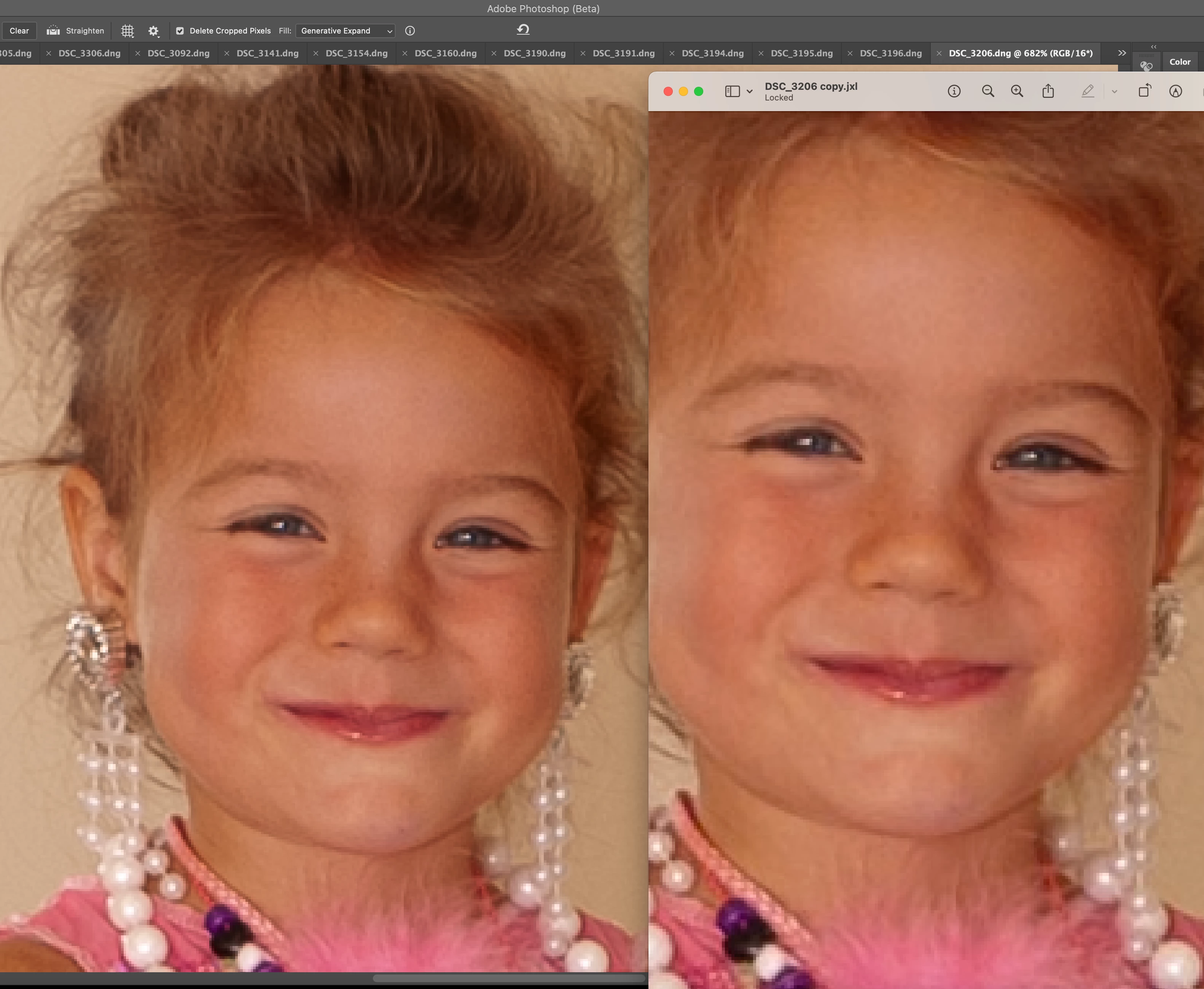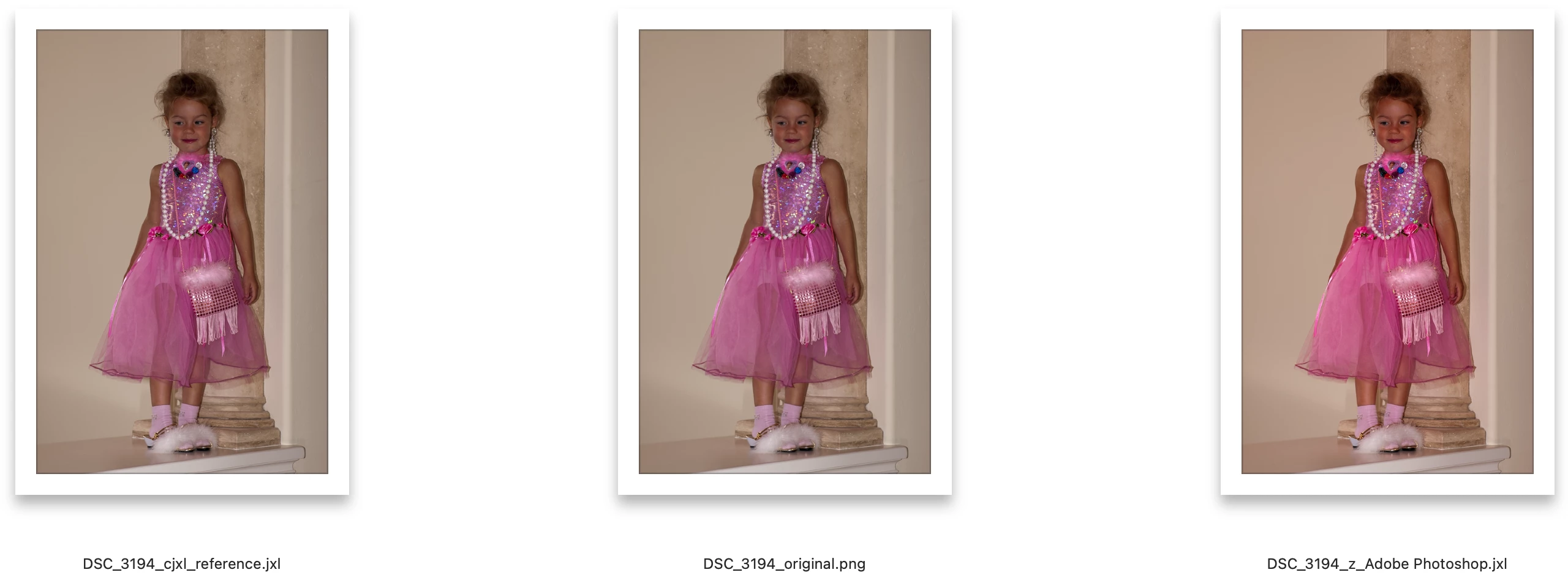 To the right is Adobe's Lossless JXL. The overall tone has shift red with an appearnt sharpening step that I did not apply.