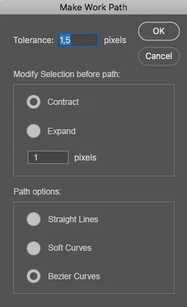 When transforming a selection to path in the Paths panel, using Make Work Path, for years that we get the same single argument "number of pixels".