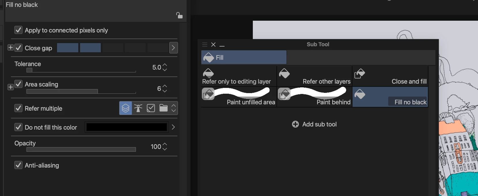 P: Paint bucket Fill tool close-gaps, tolerance & do not fill this color