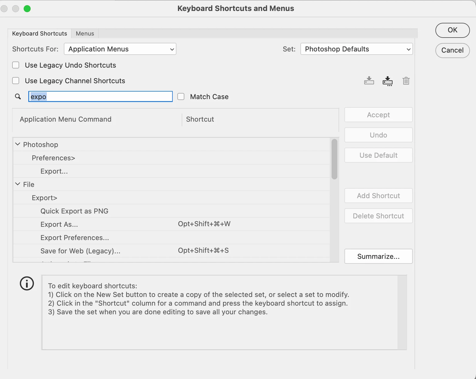 We have implemented Keyboard shortcuts search field in Keyboard shortcuts dialog. This newly introduced functionality applies to both Keyboard Shortcuts and Menus, and is effective for Application Menus, Panel Menus, Tools and Taskspaces.