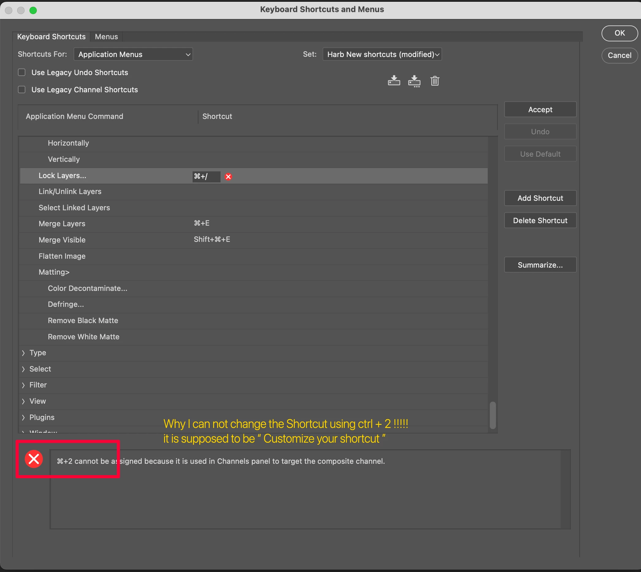 one more VERY important note, in photoshop specifically you are not allowed to make a custom shortcut using ( Alt key on windows or Opt on mac ) where you can use it in Illustrator and after effects which improved and speeded up my worflow over the years.