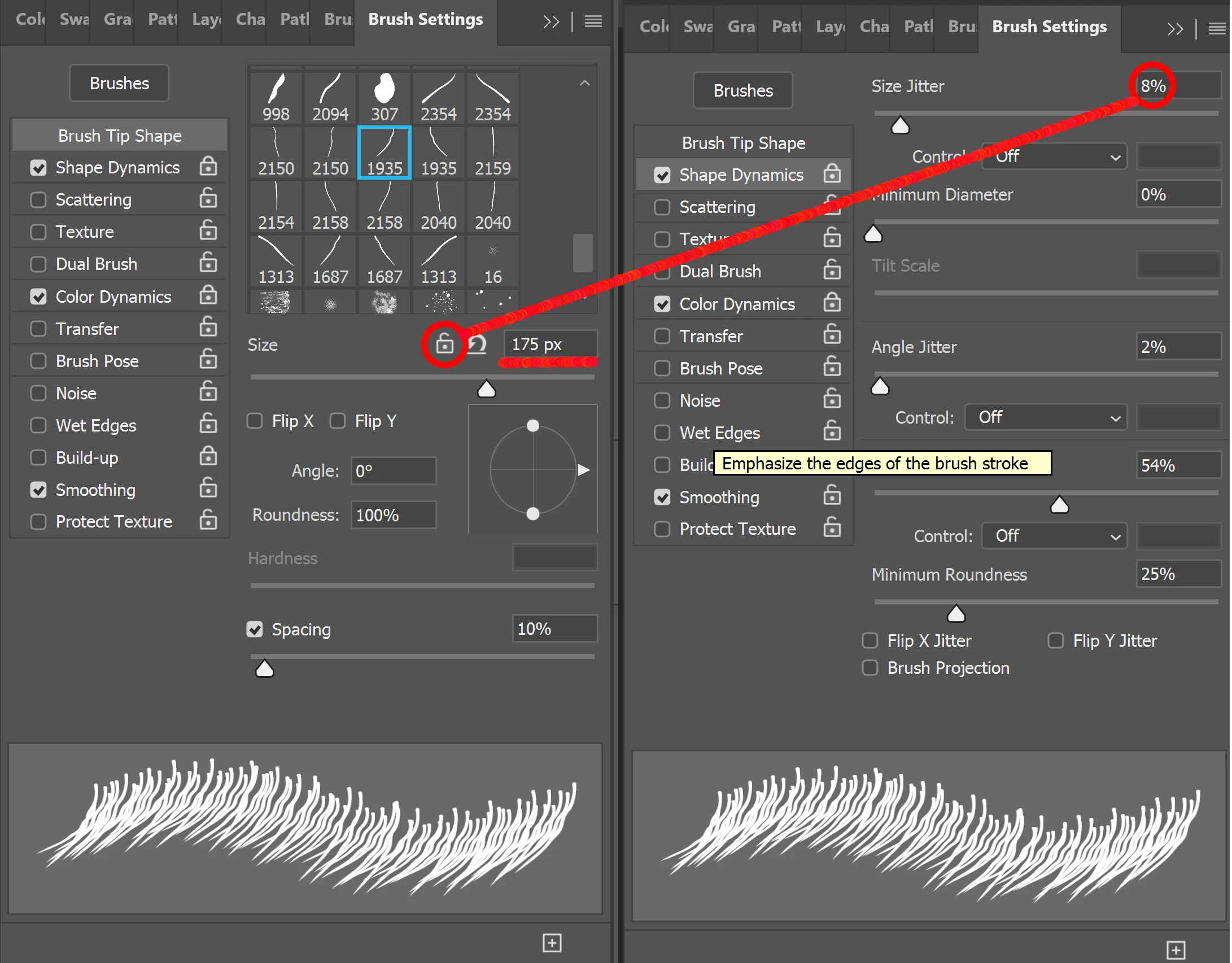 I've created 14 custom brushes for spider hairs. The ideal size for these brushes on the section I'm filling in right now is 175px. (but it will change as I go). Every time I use "<" or ">" to cycle to a new spider hair brush, it defaults back to the 1935 px size, and I have to manually shrink it back down to 175. I want the ability to lock the size of the brushes/brush set like we already have on other setting types in the brush settings window. This way it will vary the size, according to my size jitter % setting, using 175 px as its base, as I cycle through my 14 custom brushes. (visual reinforcement below)