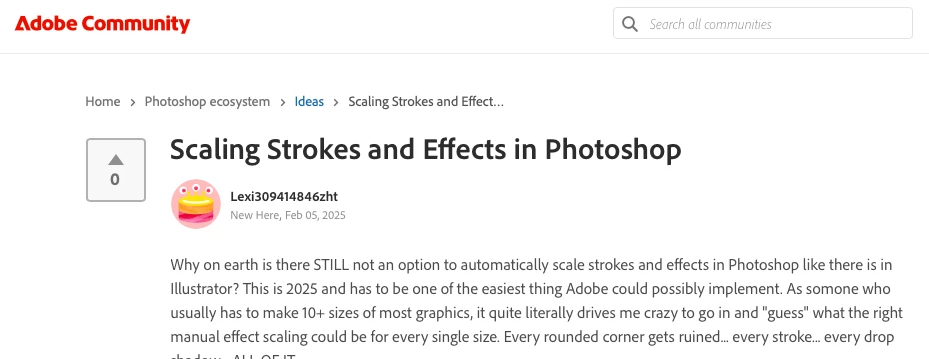 Why on earth is there STILL not an option to automatically scale strokes and effects in Photoshop like there is in Illustrator? This is 2025 and has to be one of the easiest thing Adobe could possibly implement. As somone who usually has to make 10+ sizes of most graphics, it quite literally drives me crazy to go in and "guess" what the right manual effect scaling could be for every single size. Every rounded corner gets ruined... every stroke... every drop shadow... ALL OF IT.
