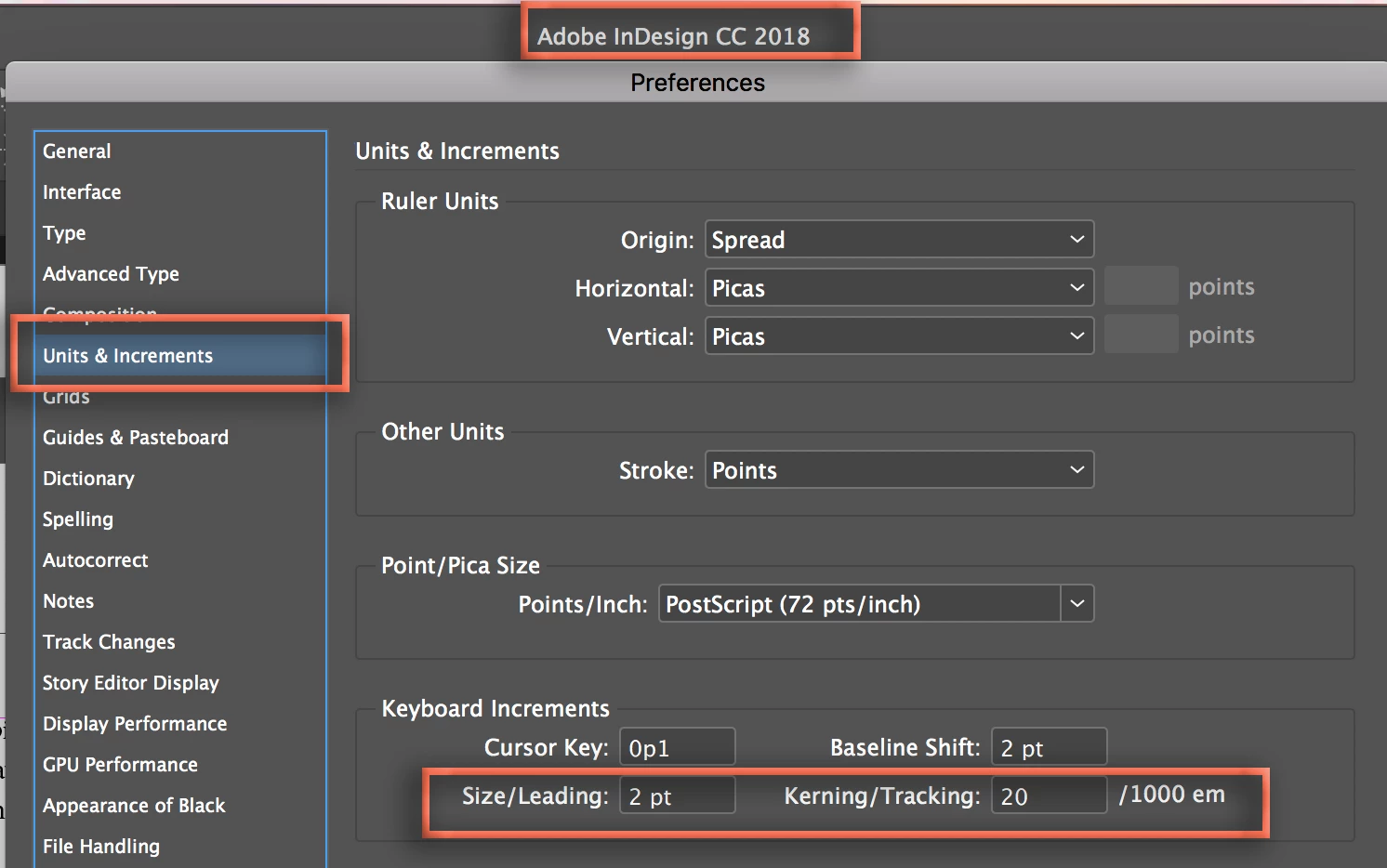 When kerning type the keyboard shortcut adjusts spacing by +/-20 units. It doesn't specify what units but I'm guessing it's points? The other fields are in points, but the kerning and leading fields don't specify.