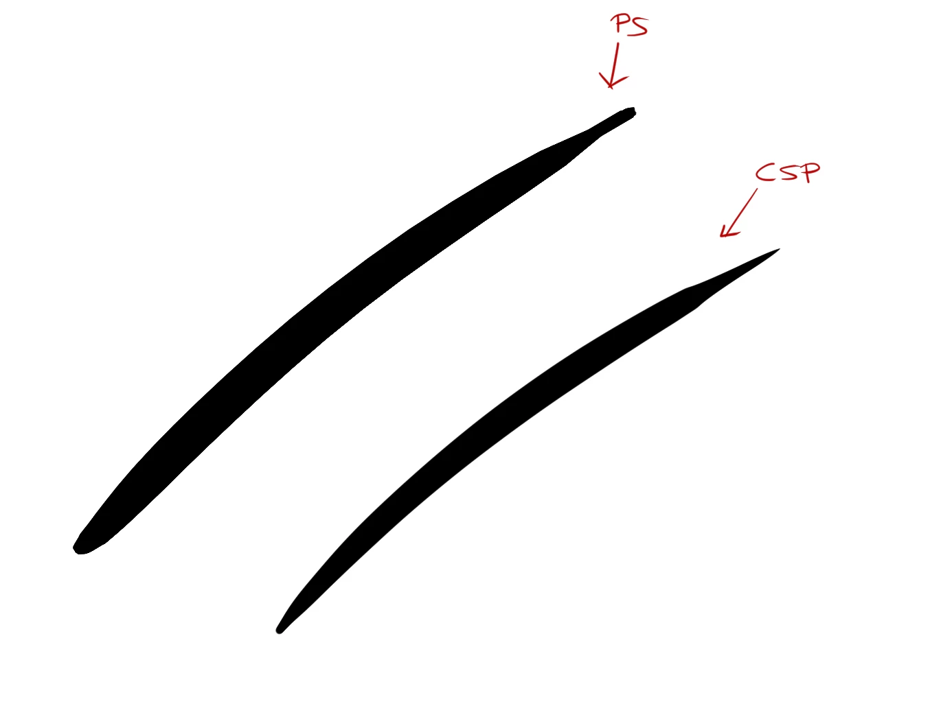 I know this is possible with pressure sensitivity, but most of the time strokes still end up not sharp. For example see the image below. I compared Photoshop to Clip Studio Paint (which has a tapered brush feature).