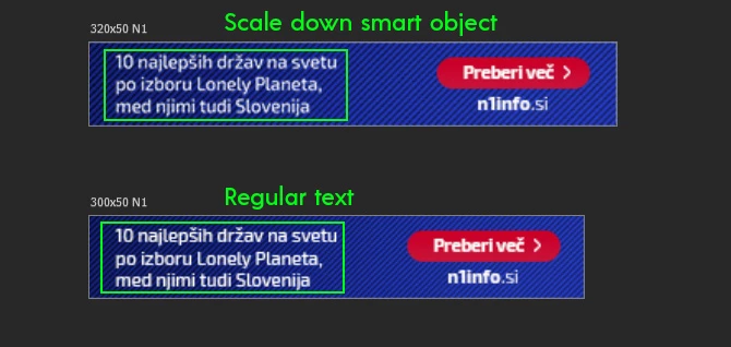 For exaple, when i use artboards for differents size banners and put same text (smart objects) on all of them we have one but Big problem. If you scale down smart object, and that smart object is a text, pixsels do not aligne corectly for small sizes. I whuld love if you chuld add some sort of Special Text-smart object with options for text pixel alignment in photoshop when we scale down that smart object.