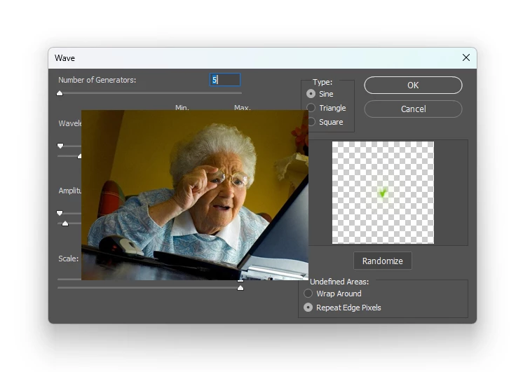 I can't find a solution anywhere, but the preview pane when using Distort > Wave is comically small, even on an ultrawide monitor. I've noticed that other filters within the Distort submenu allow for preview zooming, but not Wave for some reason. To make things worse, the white/gray transparent background preview is extremely noisy at that size, and I would like to see an option added to change the preview background.
