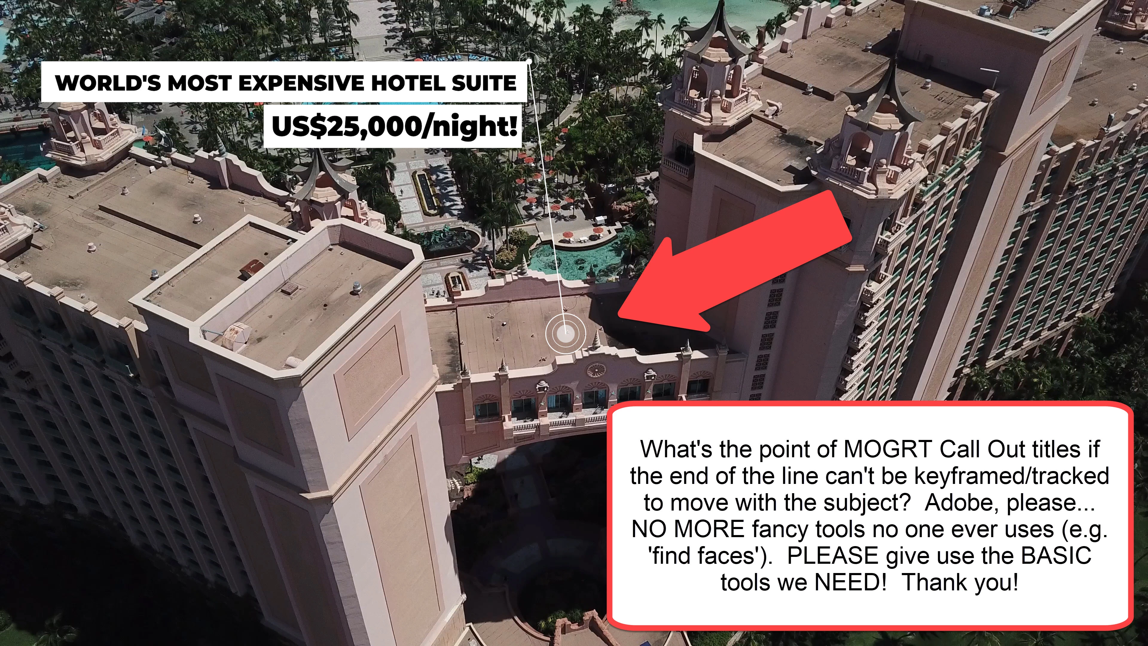 Call Out .mogrt effects are next to useless on moving images if something as basic as the position of the end of the line can't be keyframed/tracked. This basic functionality is needed ASAP! Thanks!