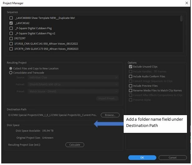 When media managing a project through Project Manager in Premiere (PC: File -> Project Manager), I always end up going back to the newly created, project managed folder and renaming it, because the new media managed project assumes the name of the project where it originally came from. 99% of the time when media managing, I want the new project folder to have a new, distinct name, apart from the original project. It would be helpful if a folder naming field could be added under or incorporated with the "Destination Path" box in order to create the name of the project that's about to be project managed (see attached image).