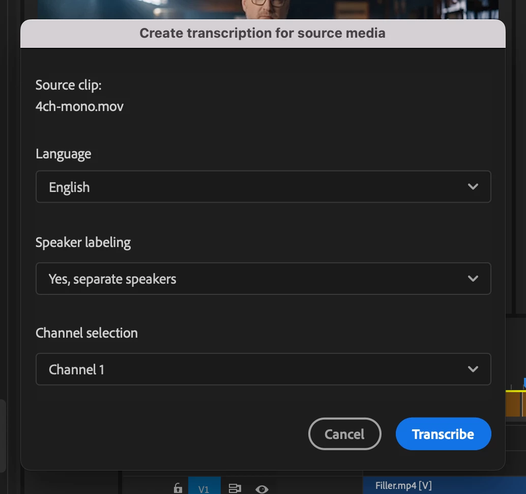 If you want to transcribe only 1 specific channel of your multi-channel audio, you can double click on the source clip and then click on "Transcribe" in the Text panel (or: right-click on source clip in Project panel and select "Transcribe". This will open the transcription settings where you can select the channel you want to transcribe in a drop-down menu.