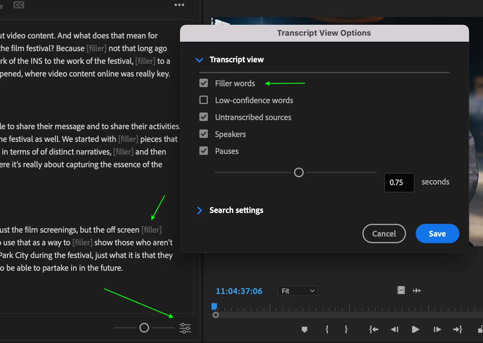 2. Did you double check if fillers are turned on? You can do this in the "Transcript view options" (in ther ... menu, or in the little icon in the bottom right of the Text panel). It looks like this: