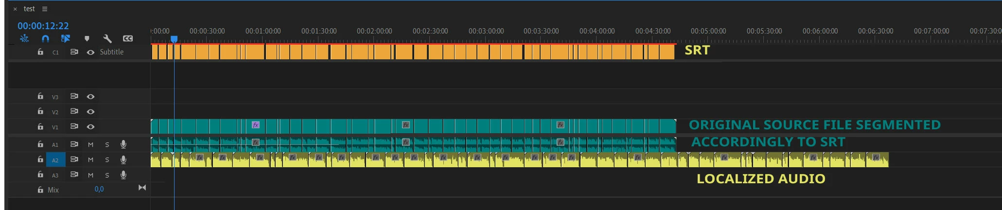- We start with a source file (mp4 and SRT) where the SRT is segmented by full sentences for use in audio recordings of localized content.