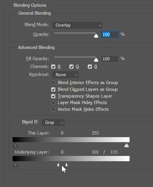 Basically you can have the effect of the top layer appear on a range of values present below it. So for instance a checkerboard overlay only shows up on pixels 0-20% out of 100%.