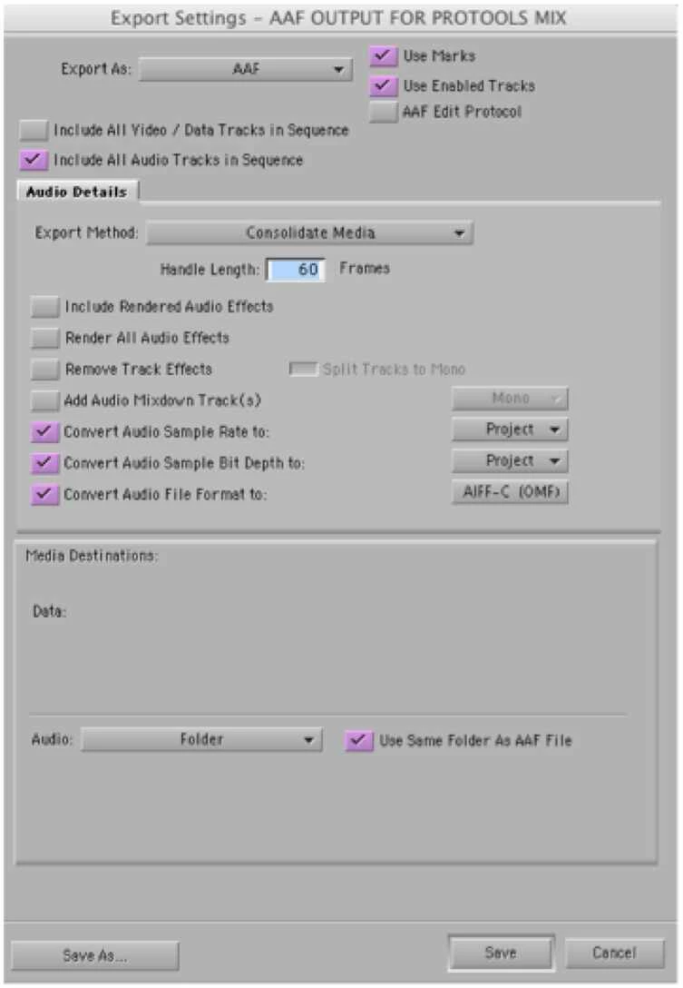 For reference, I'm attaching the AAF export settings window from AvidMC.