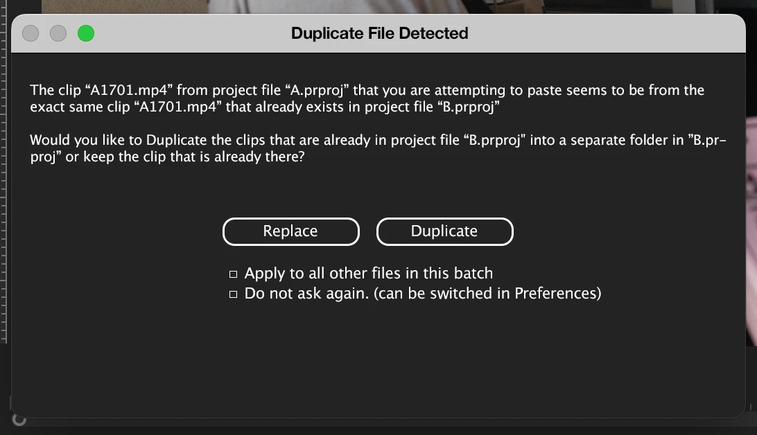 This is similar to Finder/Explorer copying and pasting solutions as Premiere gives the user no option. In its current context Project files become increasingly polluted, especially if you're using multiple clips from multiple projects.