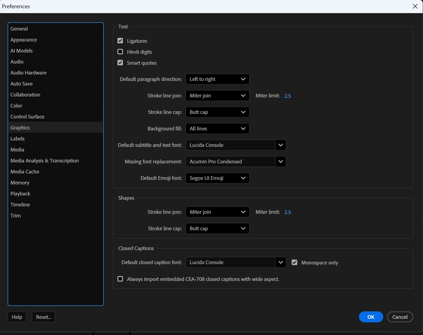 Default Caption Settings in Preferences