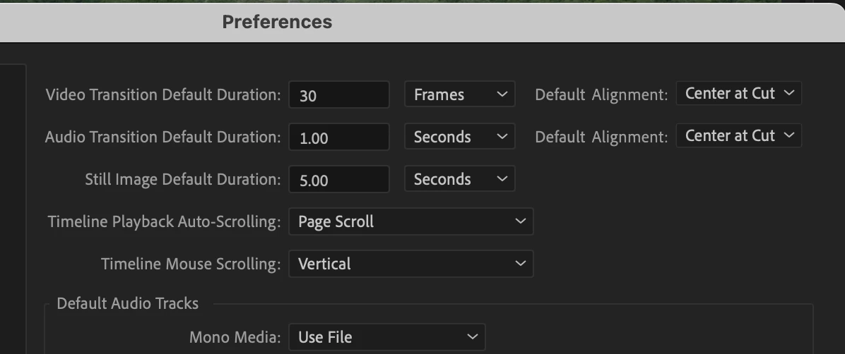 In preferences, you can set a length for default transitions, but not a position. Once the transition is in place, you can go into Effect Controls and set it to End at Cut, Center at Cut, and Start at Cut, but it would be nice to be able to set that parameter as a default, so I don't have to move it everytime I drop in a default transition.