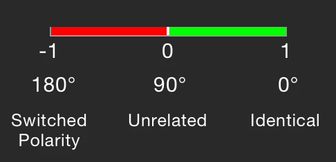 In a phase correlation meter, these three stages are normally described on a linear scale going from -1 (switched polarity) over 0 (unrelated) to 1 (identical). The numbers -1, 0 and 1 are not randomly chosen as they are the cosine of the angle of degrees of the phase difference between the two sources.