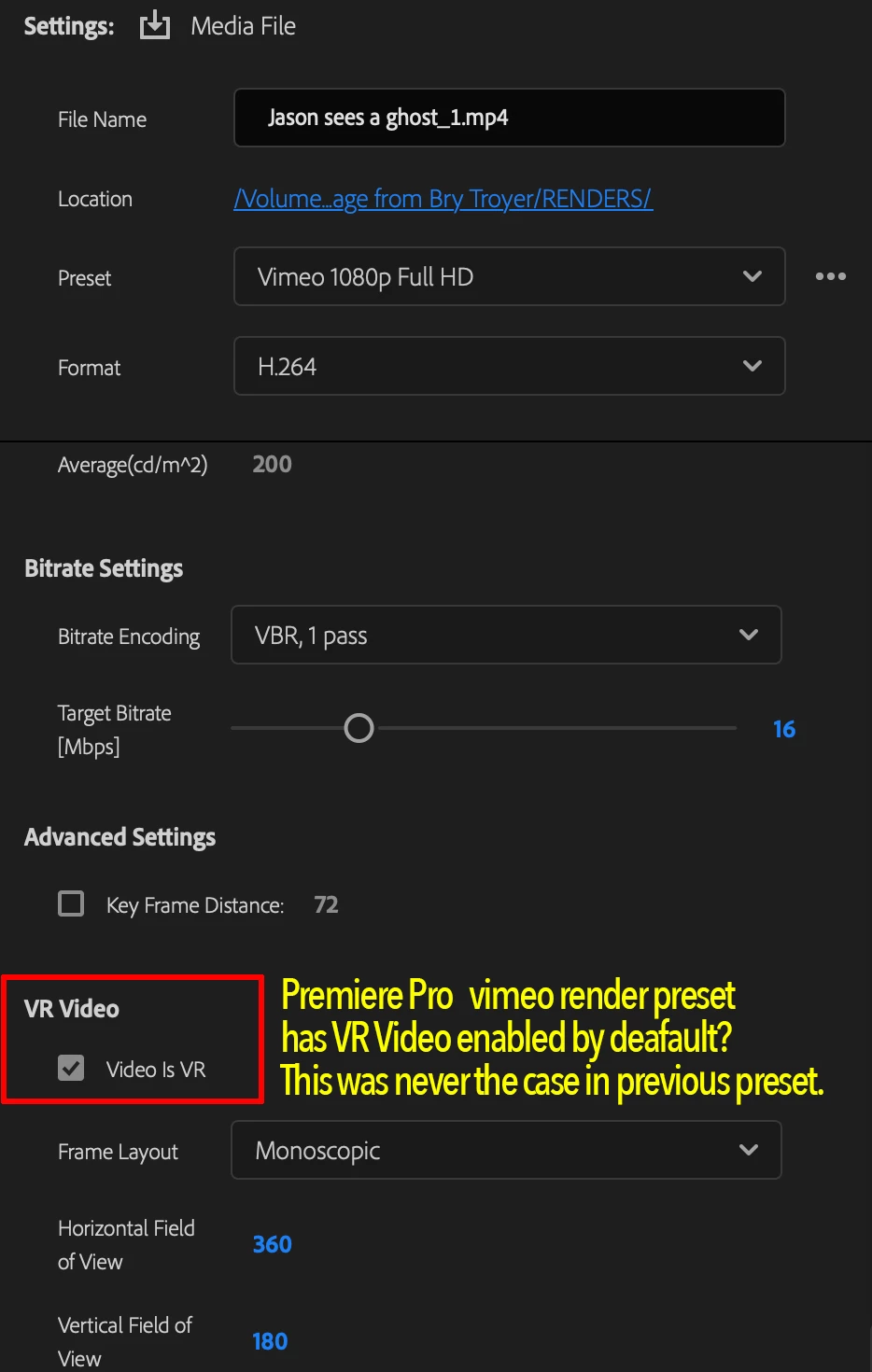 I have been rendering with the vimeo preset for many years, over many versions of Premiere Pro. Recently I uploaded a video rendered from Premiere version 24 that would not display correctly on vimeo. The video was enlarged and cropped into the center. The vimeo tech support determined that VR video metadata was tagged to the render. I opened the video panel in the vimeo render preset and...voila! Sure enough, VR video was enabled. Once turned off, the new render and upload worked exactly as expected. Why is VR video enabled now, as the vast majority of videos are NOT VR?