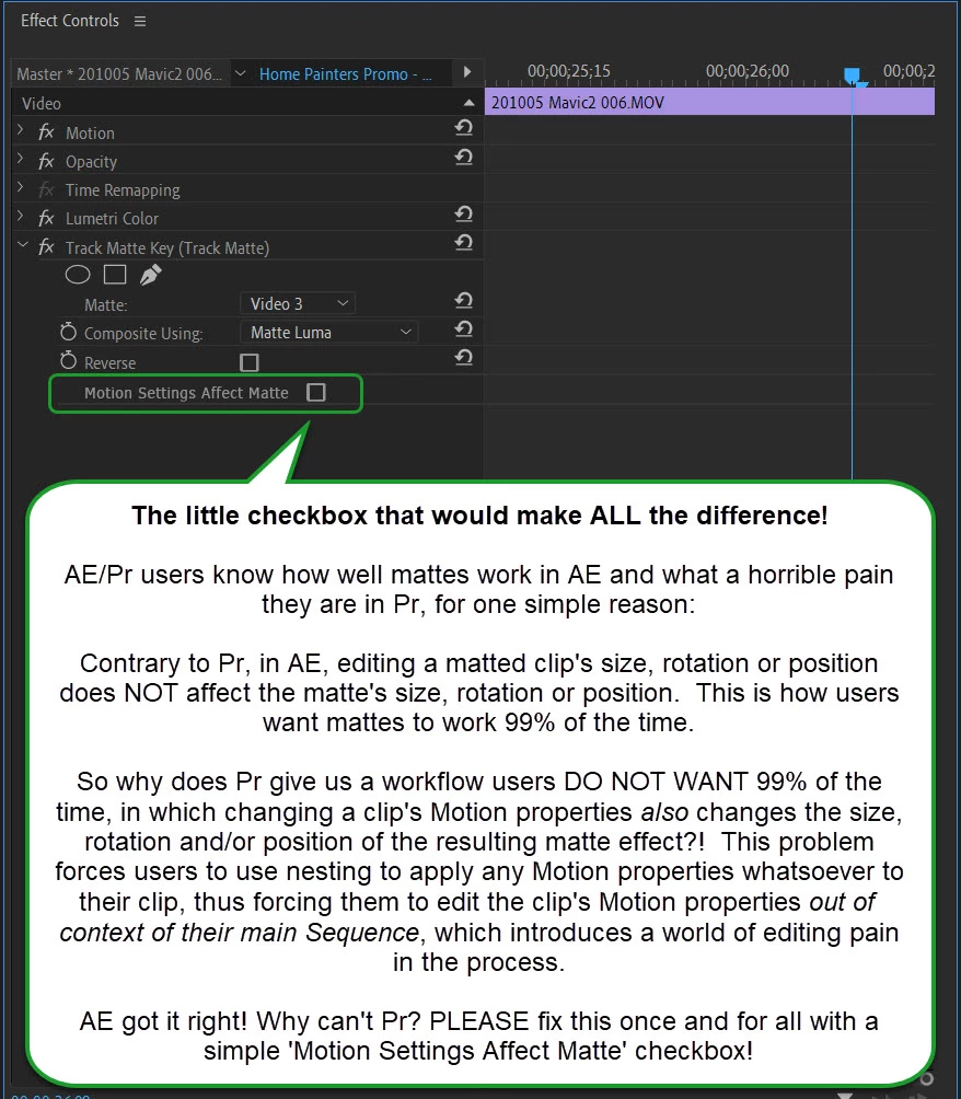 A simple way to fix this problem, that would serve the needs of everyone, would be to simply add a "Motion Settings Affect Matte" checkbox to the Track Matte effect, and leave it unchecked by default. This way, the 0.0001% of users who want track mattes to work the way they currently work in Premiere could continue with the current workflow, just by clicking the checkbox, and the 99.9999% of users who want PP's matting to work the way it does in AE could finally have AE's far superior matting workflow inside Premiere!