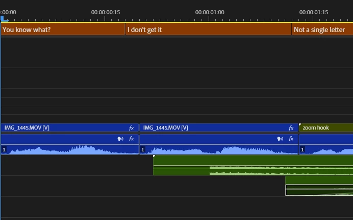 This timeline shows newly generated subtitles (in orange) placed above video clips (in blue). Currently, the subtitle segments don’t match the video cuts — they continue across edit points.