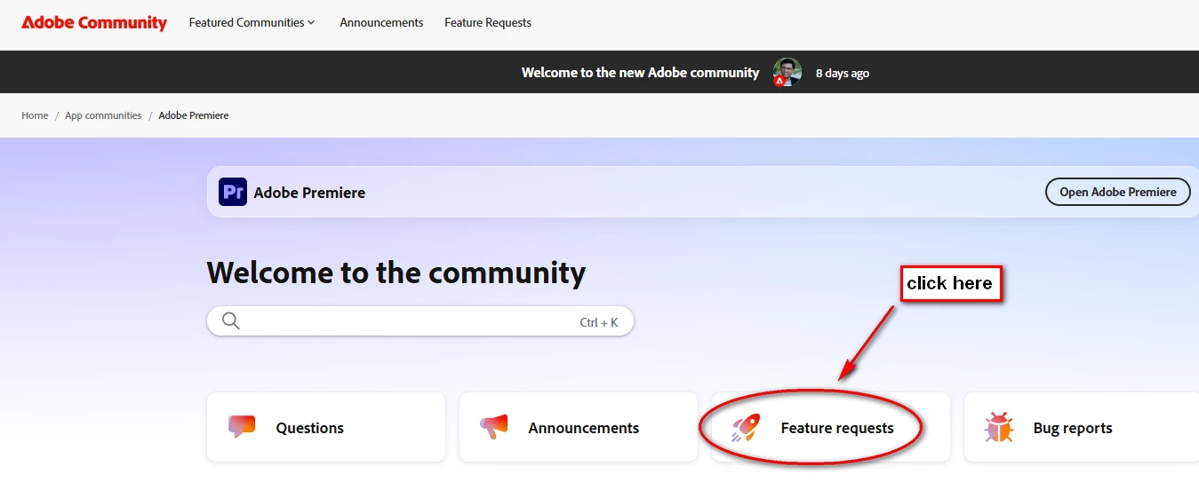 Describe your question:how do i post a request for a new feature for Adobe Premiere? I can get to the forum, but I do not see any way to post. Thank you