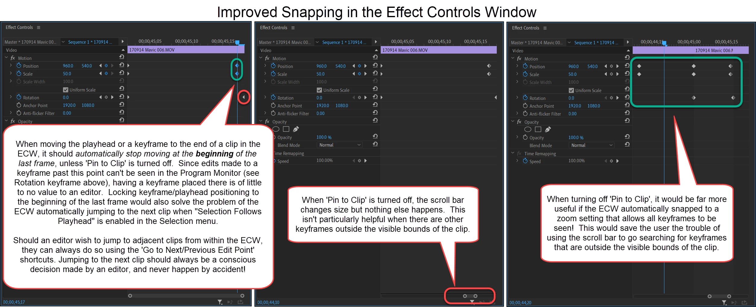 1. When moving the playhead to the end of a clip in the ECW, dragging a keyframe to the end, or jumping to the end with the 'Go to next edit point' shortcut, the playhead and/or keyframe should automatically snap to the beginning of the last frame rather than to the end of it. This way, the clip loaded in the ECW remains visible in the Program Monitor, rather than the ECW and Program Monitor jumping to the next clip!