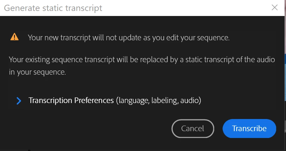 Improve the dialog box that warns that static transcriptions do not support text-based editing